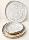 Set of three handcrafted plates, one of each size. Large (11" diameter), medium (8.5" diameter), and small (6 "diameter), all 1" tall.